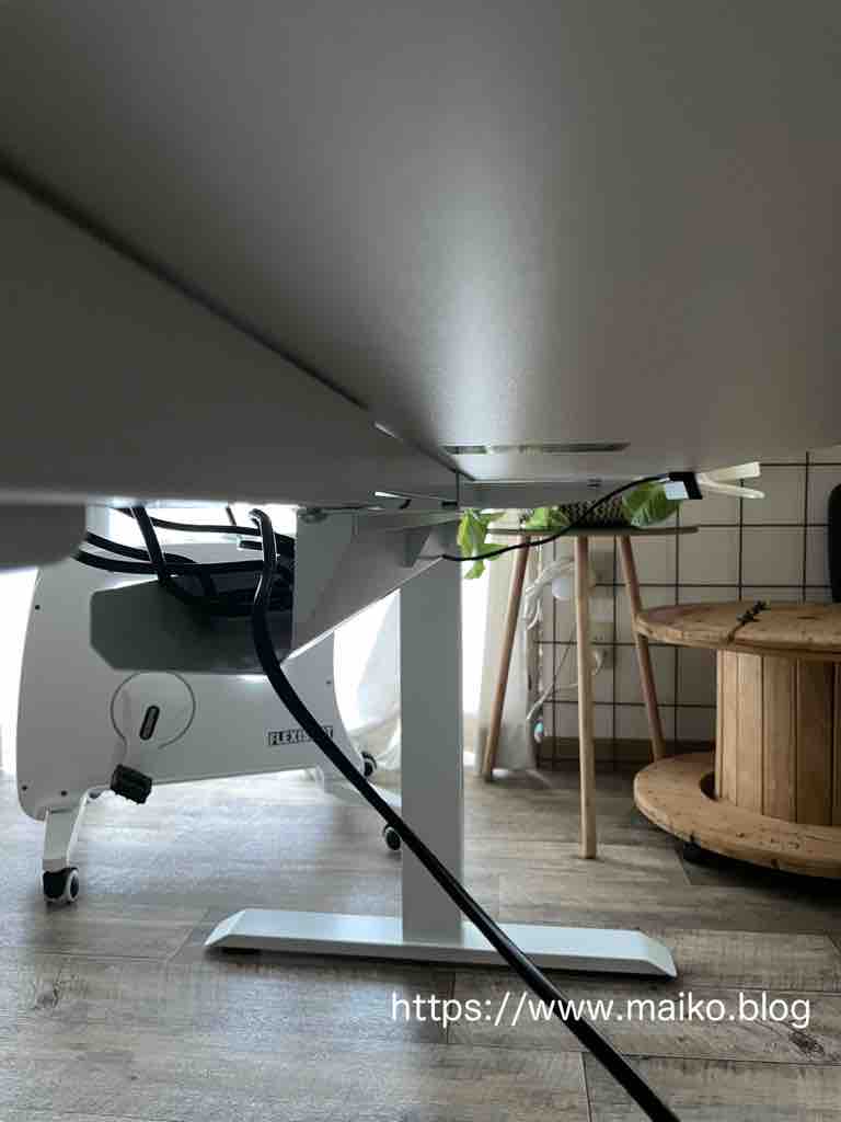 この昇降デスク、デスク周りでごちゃごちゃしがちなコンセント類が隠せるようになっているのもいいところ。