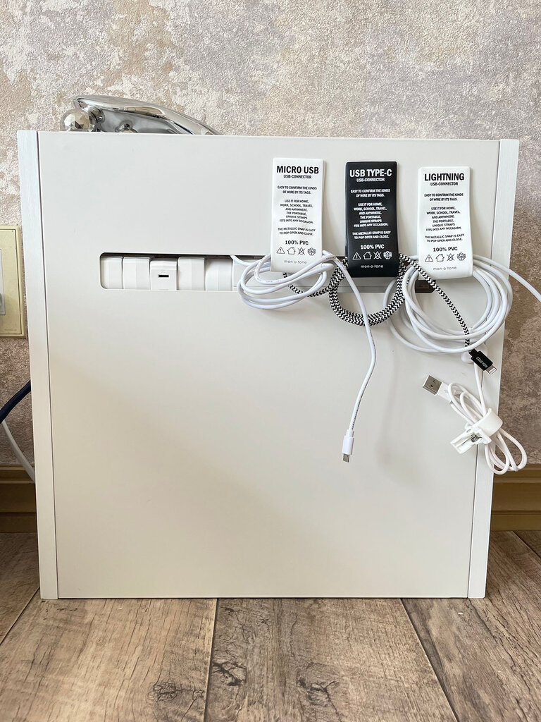 こたつが仕事スペースとなると、こたつやカーペットのコードにPCやスマホの充電器などコード類がごちゃごちゃするのが嫌だったので、こちらはケーブル収納ボックスに隠しました。
