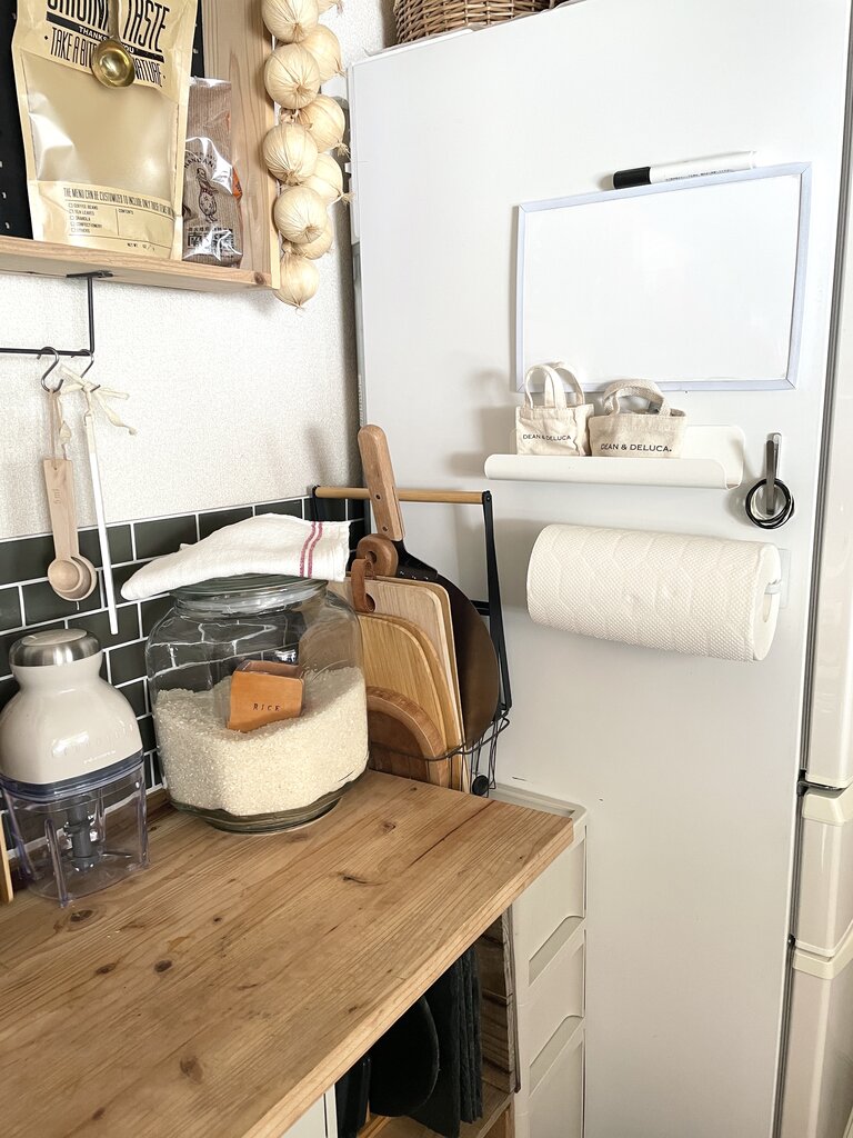 冷蔵庫にペタペタ貼るのは好きではないのですが、唯一貼っているキッチンペーパーホルダーの上のホワイトボード。