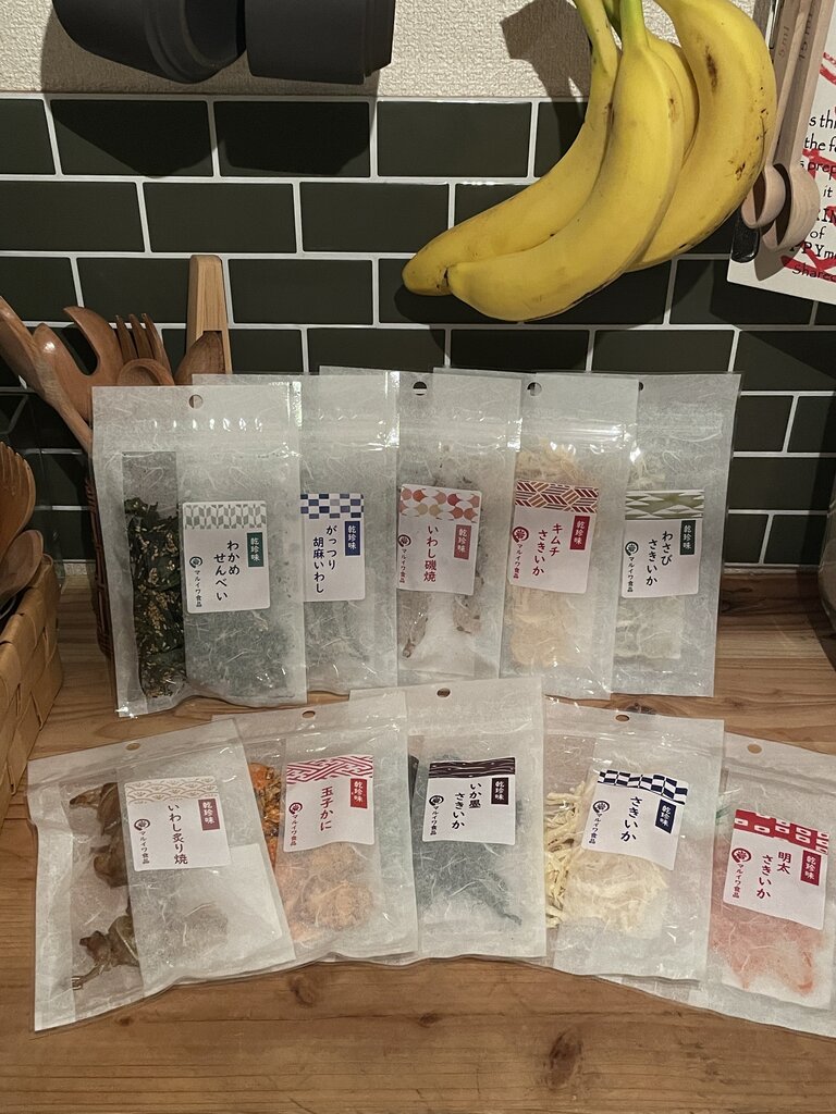 特にわかめせんべいと明太さきいかとわさびさきいかとがっつり胡麻いわしが好き。
