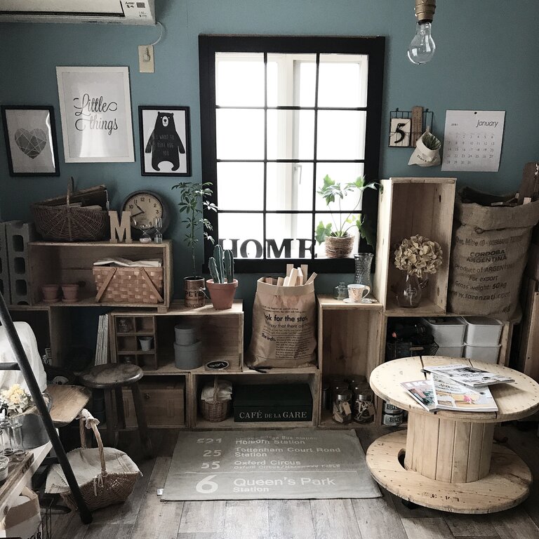一世を風靡したりんご箱やケーブルドラムをインテリアに導入しました。