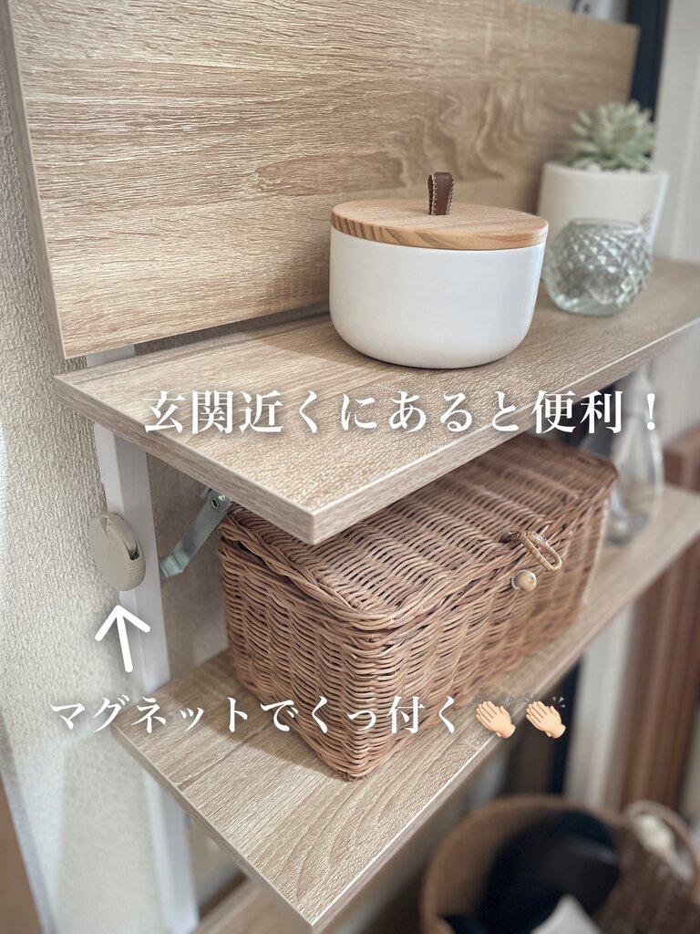 本当は玄関ドアにマグネットがくっ付けば良いのですが、我が家の玄関ドアにはマグネットがくっ付かない&玄関にモノを置ける下駄箱や棚がないので、玄関入ってすぐの場所に突っ張り壁面ラックを設置して、そこに玄関近くにあると便利なモノをまとめています。