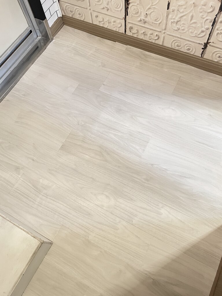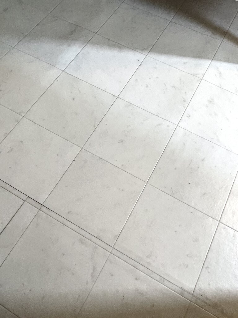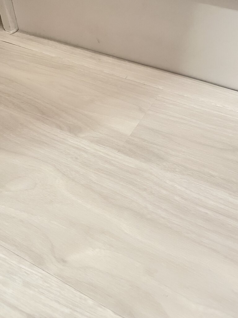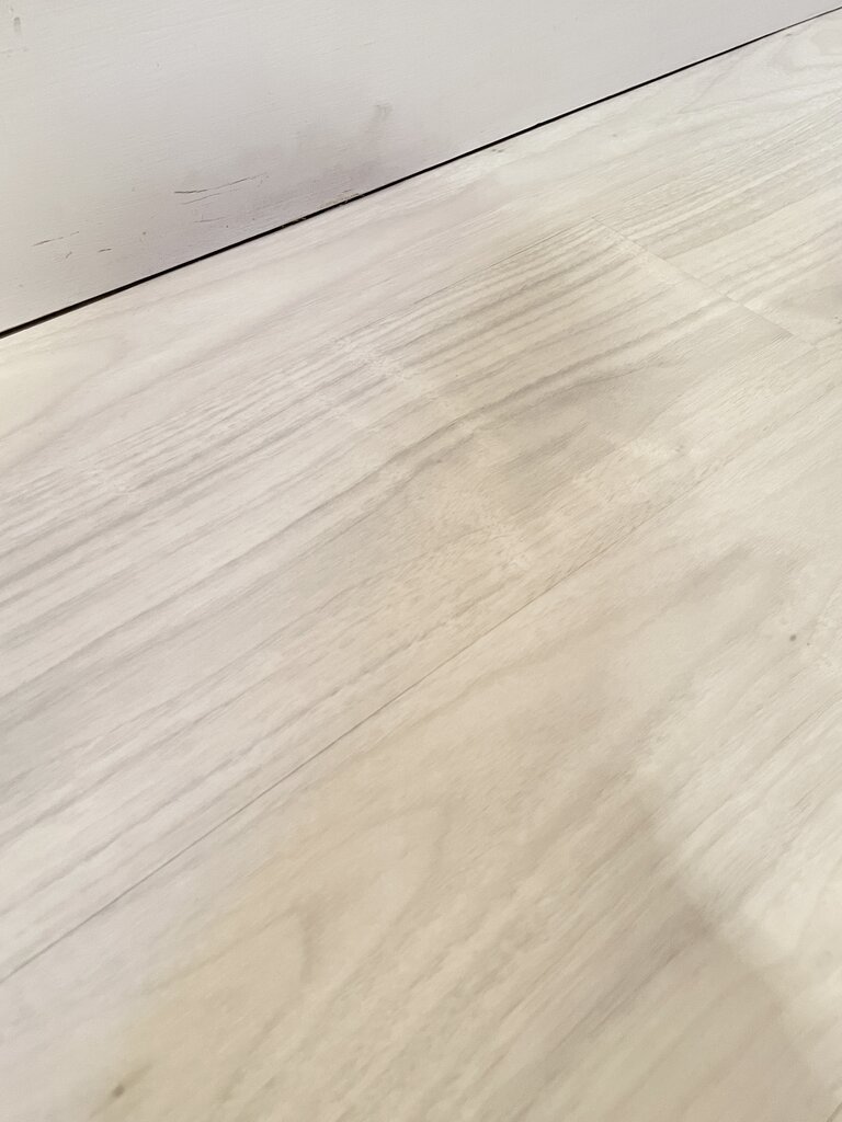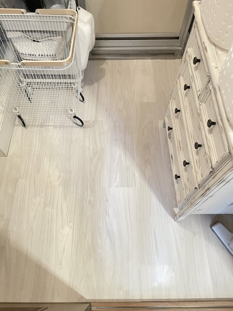 実は今敷いているクッションフロアも大理石調のホワイトなのですが、ケッチって購入したもんだから施工がギリギリで、継ぎはぎして敷いていました。