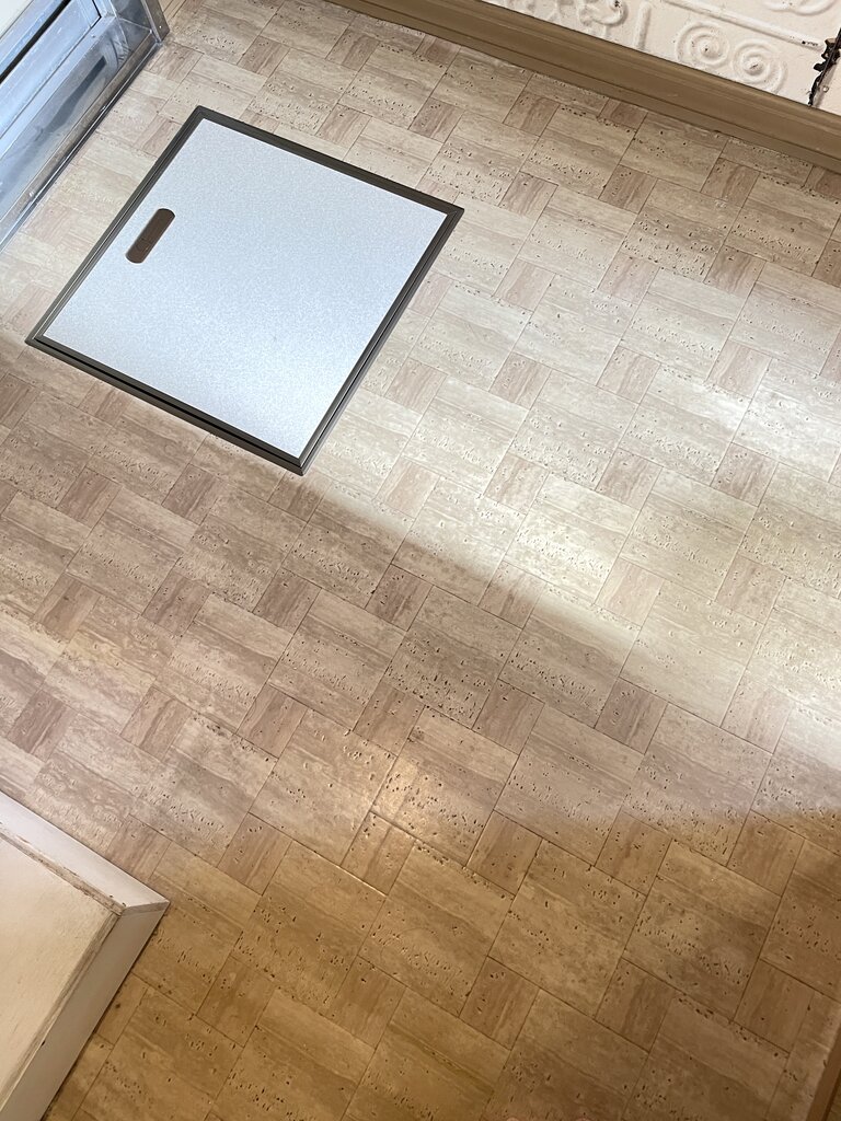 なんとも言えない柄のクッションフロアに、床下収納の蓋だけ柄も色も違うという世にもホラーな現象が・・