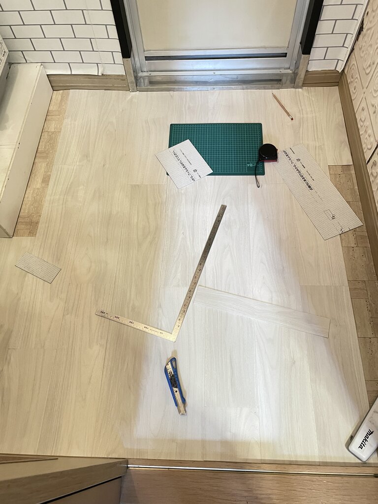 こんな感じでどんどん貼り進めていき、端も同じ要領でカットして敷き詰めます。