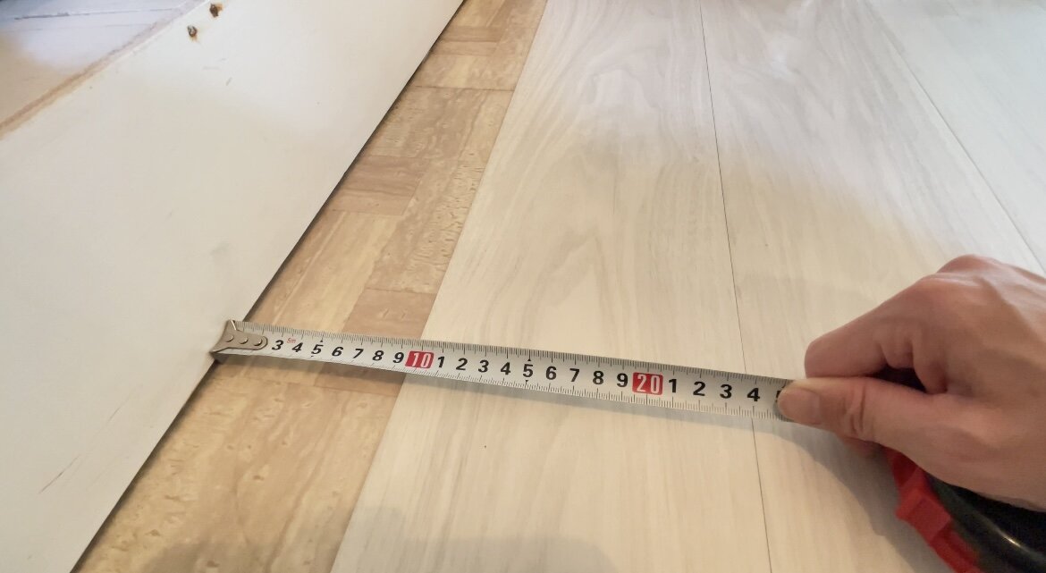 この際、両脇の余りが5cm以内だとピタフィーが剥がれやすくなってしまう為、両脇が5cm以上になるように調整しながら敷き始めを決めました。