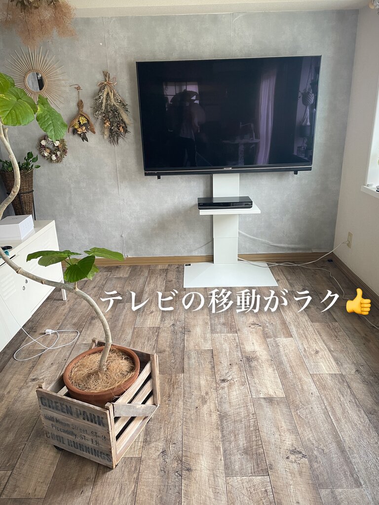 このテレビスタンド、壁にぴったりくっ付くから大きいテレビでも圧迫感も軽減されるし、邪魔にもならないし、本当おすすめです♬