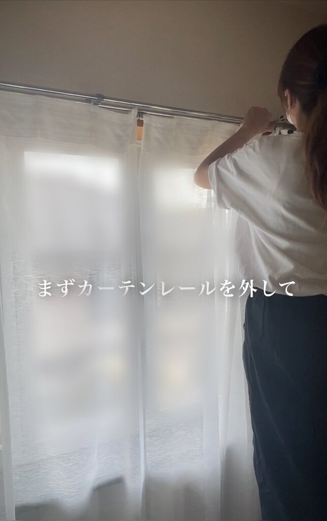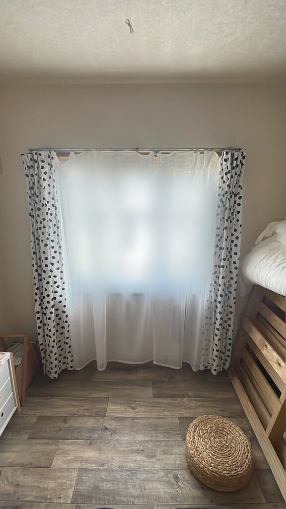 この窓は腰高ですが、余っていたレースカーテンとIKEAの生地を買ってきて作った手製のカーテンをつけていました。