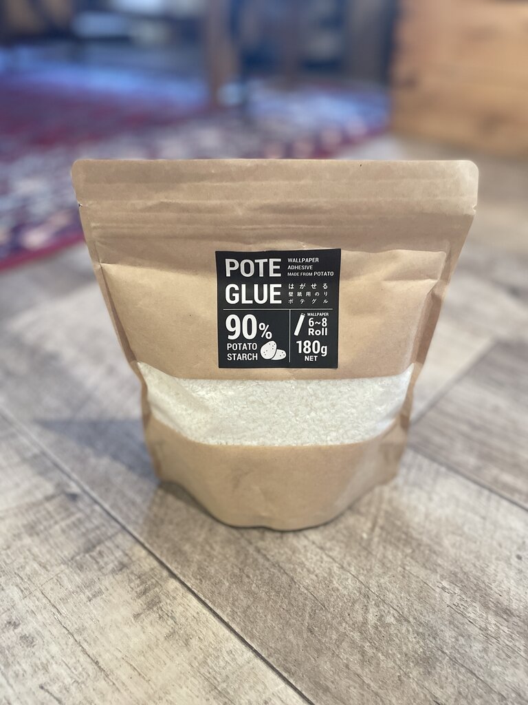 今回玄関に貼った壁紙も、賃貸にも優しい貼って剥がせる粉のりを使って貼ったのですが、今回は初めてポテグルという主成分の90%がじゃがいものデンプンでできている粉のりを使ってみました。