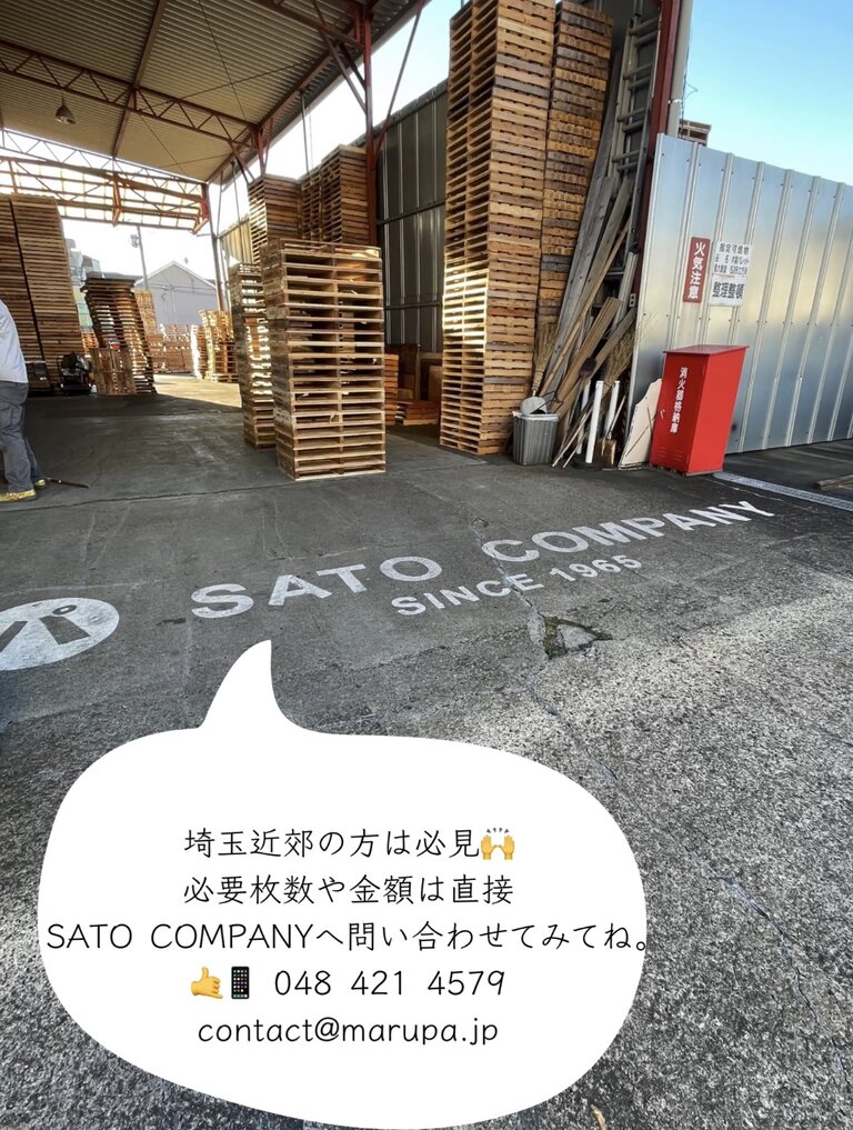 引き取り限定にはなってしまうのですが、こちらの埼玉工場近辺で取りに行けるという方はワンコイン以下〜1000円で中古の木製パレットを譲っていただくことができますので、ぜひお近くの方はお問い合わせの上足を運んでみて下さいね♬