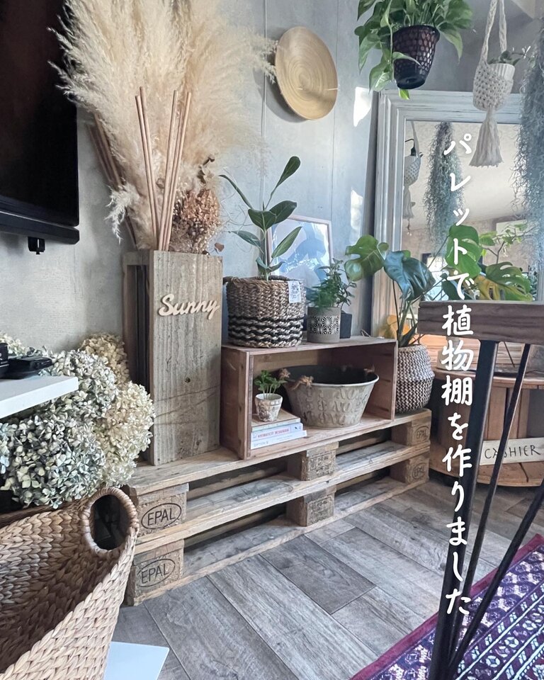 リビングの出窓の植物を守るため冬の間は部屋の中に入れたのですが置き場がなくなってしまったので、早速持ち帰ったパレットの1枚をカットして植物棚を作ってみました。