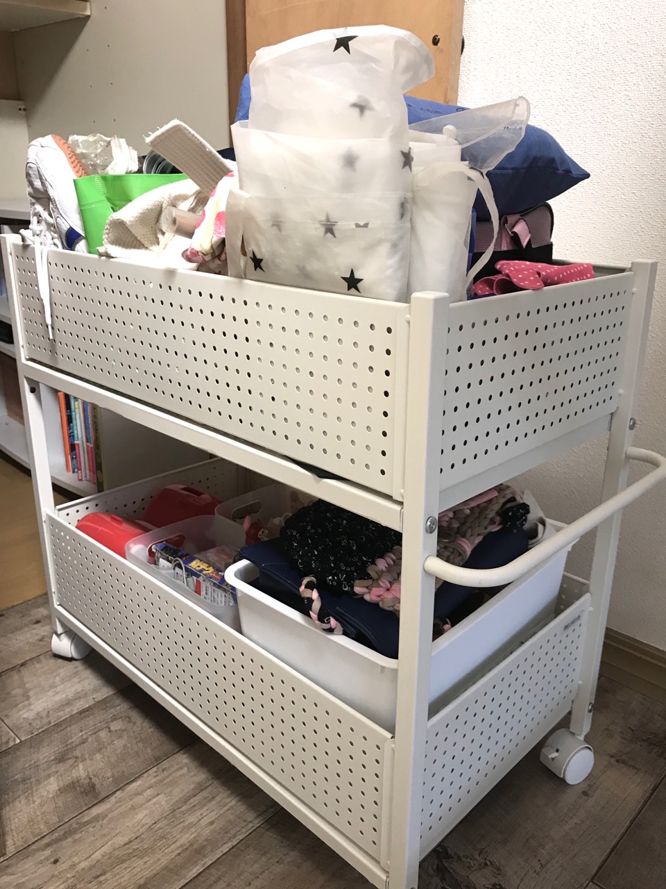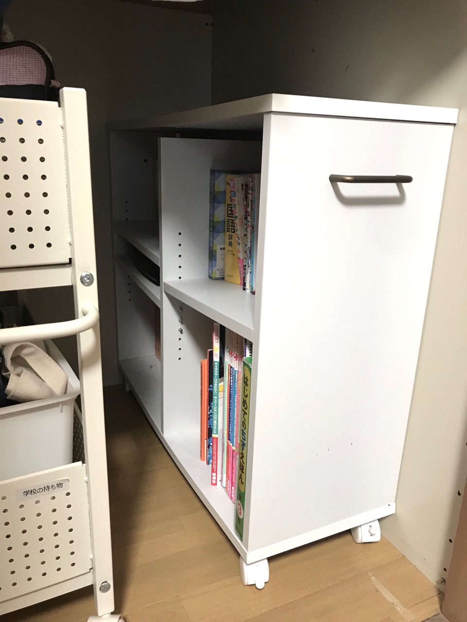 山善のキャスター付きワゴンの上部分には学校で必要なモノ。