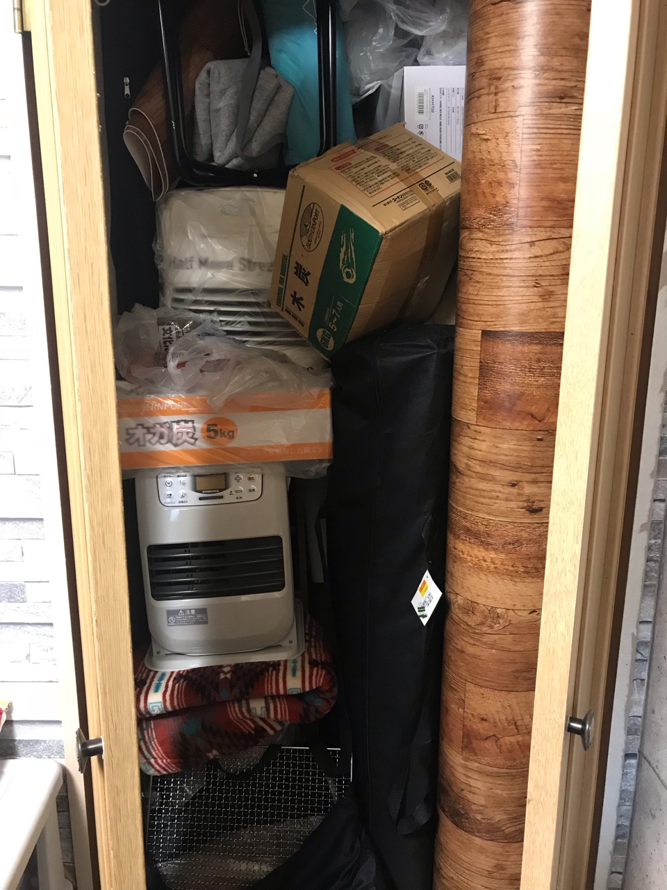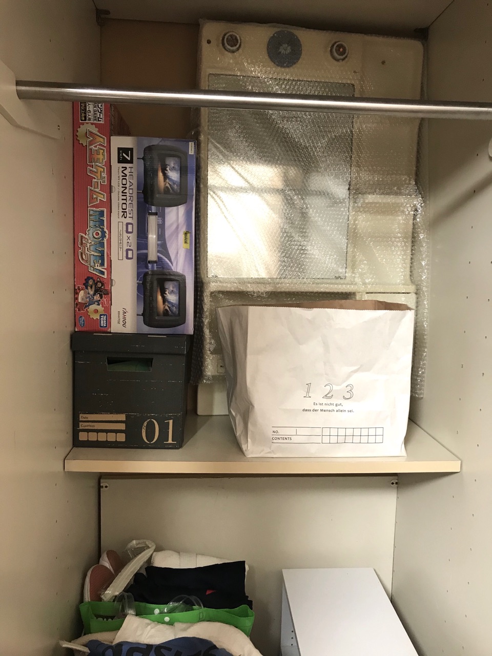 一旦全部出したところで、古くて狭くて仕切りも1枚しかない使いにくいクローゼットですが、ないよりマシです。(笑)