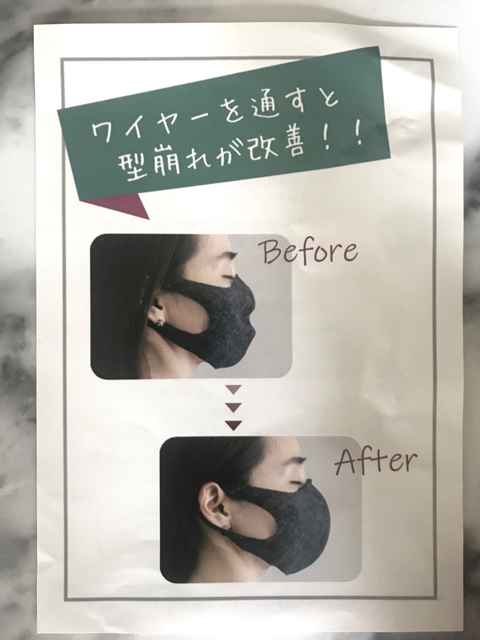 それが気になって私はこのタイプのマスクを購入するのをためらっていたのですが、ワイヤーが付属ならどうかなーと期待も込めて購入してみました。