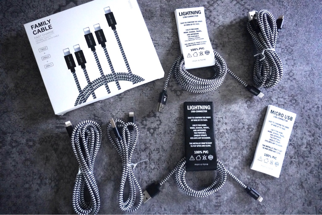 我が家は全員iPhoneなので、ライトニングケーブル用を2つと、モバイルバッテリーやカメラなどを充電するマイクロUSB用を1つ選びました。