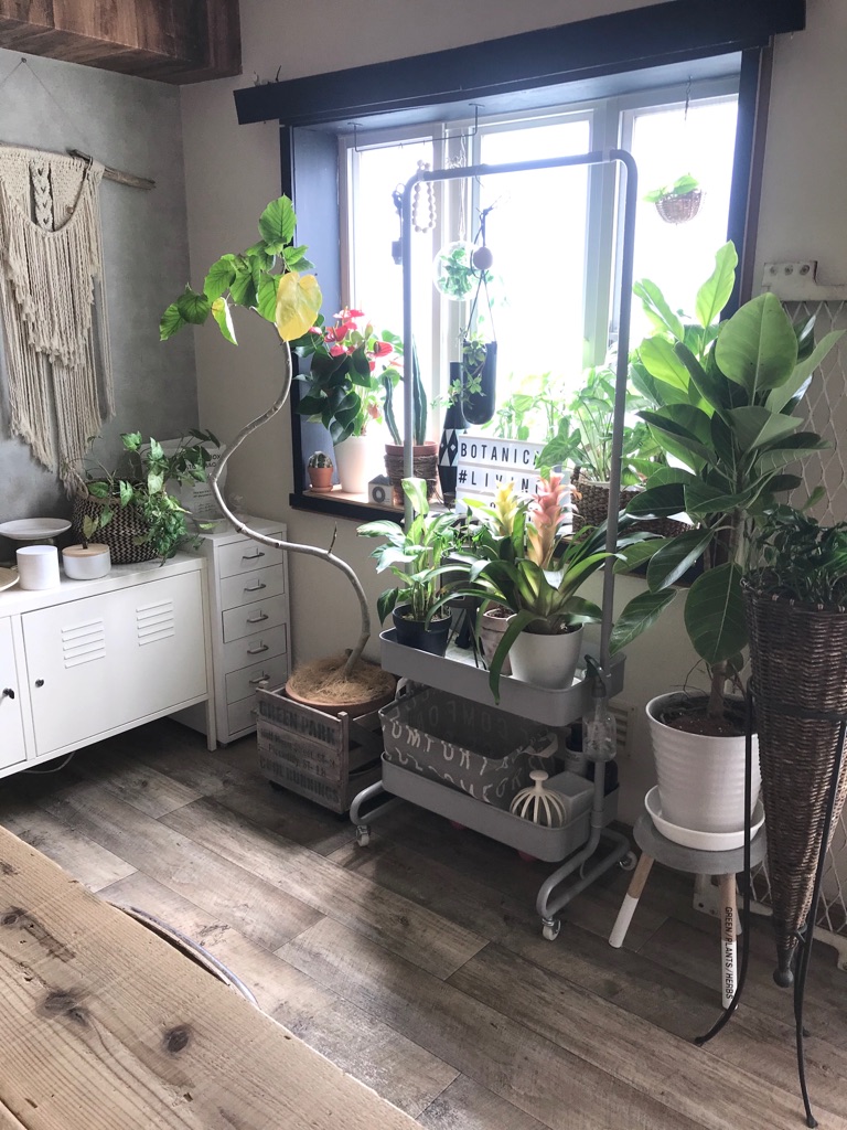 今回もっと増えてしまったので、別の場所で収納に使っていたトローリーハンガーを出窓側に持ってきて植物たちを置くコトにしました。