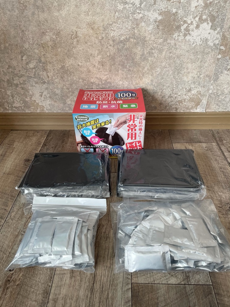こちらの非常用トイレは家用と車用に50個ずつ分けました。