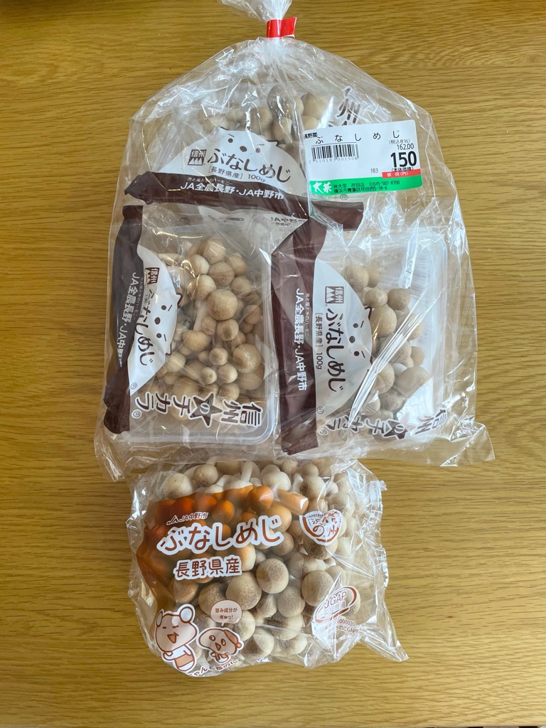 ぶなしめじは小さめだけど房が3つ入って150円、