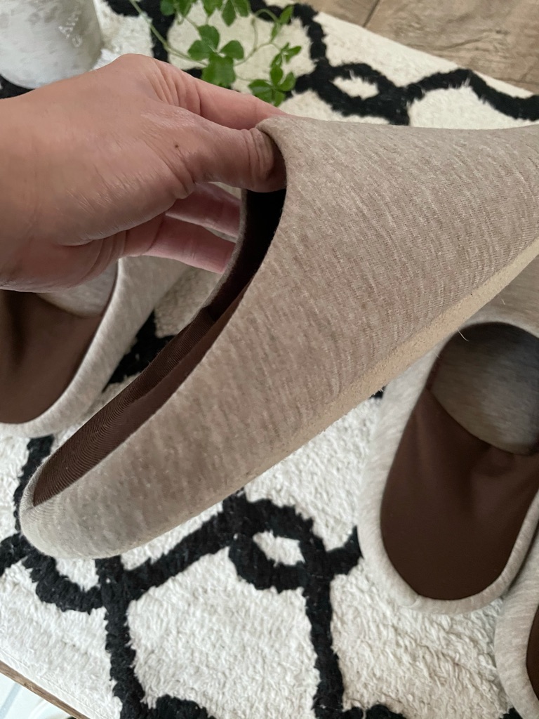 このしまむらスリッパ、このまま履いてもいいけどパカパカが気になるって人は、茶色い部分にかかとをピッタリフィットさせて履くことができる。