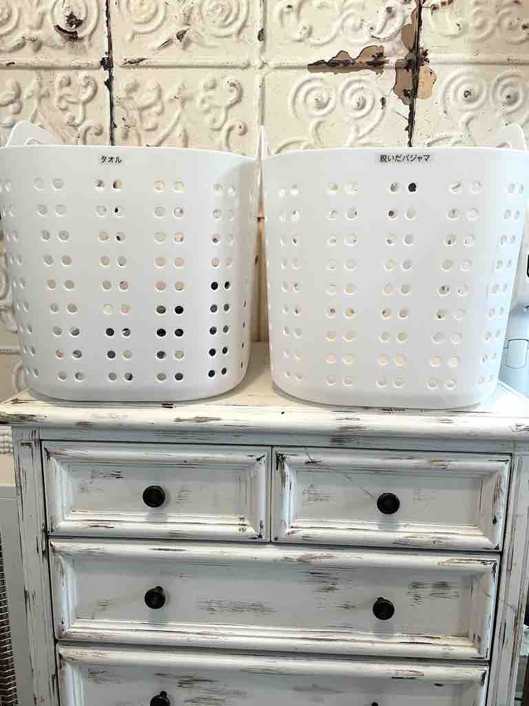 もうひとつのニトリの洗濯カゴには、先日Rinのシンプルライフのリンさんが、洗面所に部屋着やパジャマの一時置き場所を作っているのを見てとても便利そうだと思ったので、我が家もひとつは部屋着やパジャマの一時置き場所にしました。