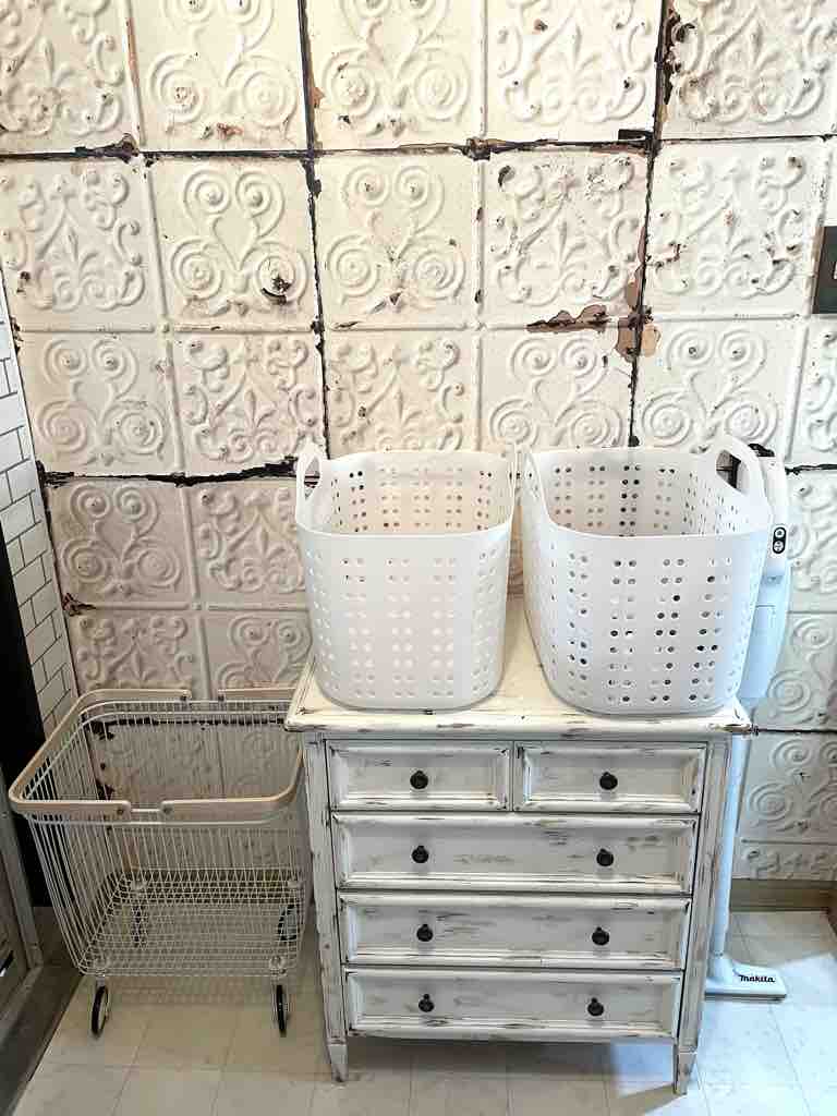 今まではニトリの洗濯カゴをふたつ使っていたのですが、小さめで常に洗濯物が溢れているので、脱いだ服(洗濯物)はアンドウッドのランドリーバスケットに、タオルやマスクなどはニトリの洗濯カゴに入れるコトにしました!